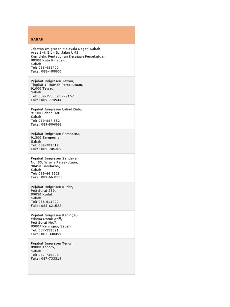 Aras 1-4 Blok B Kompleks Pentadbiran Kerajaan Persekutuan Jalan Sulaman 88450 Kota Kinabalu Sabah. Senarai Cawangan Pejabat Imigresen Negeri Sabah. Pejabat Imigresen Tawau Tingkat 1 Rumah Persekutuan 91000 Tawau Sabah Tel.